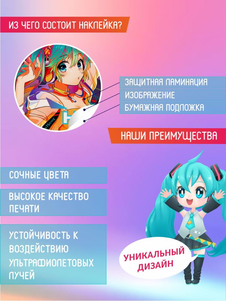 Наклейки на автомобиль Аниме - Большая наклейка на автомобиль HATSUNE MIKU. О, эта японская виртуальная певица вскружила голову миллионам поклонникам. Она не просто талантлива - но и очень красива, было бы преступлением не сделать винил с ее образом. В ней идеально все, так же как и в нашей ливрее - яркость печати, материал, универсальный размер. Мику Хацунэ - стала поп идолом, а твой автомобиль с такой наклейкой - станет предметом зависти.
