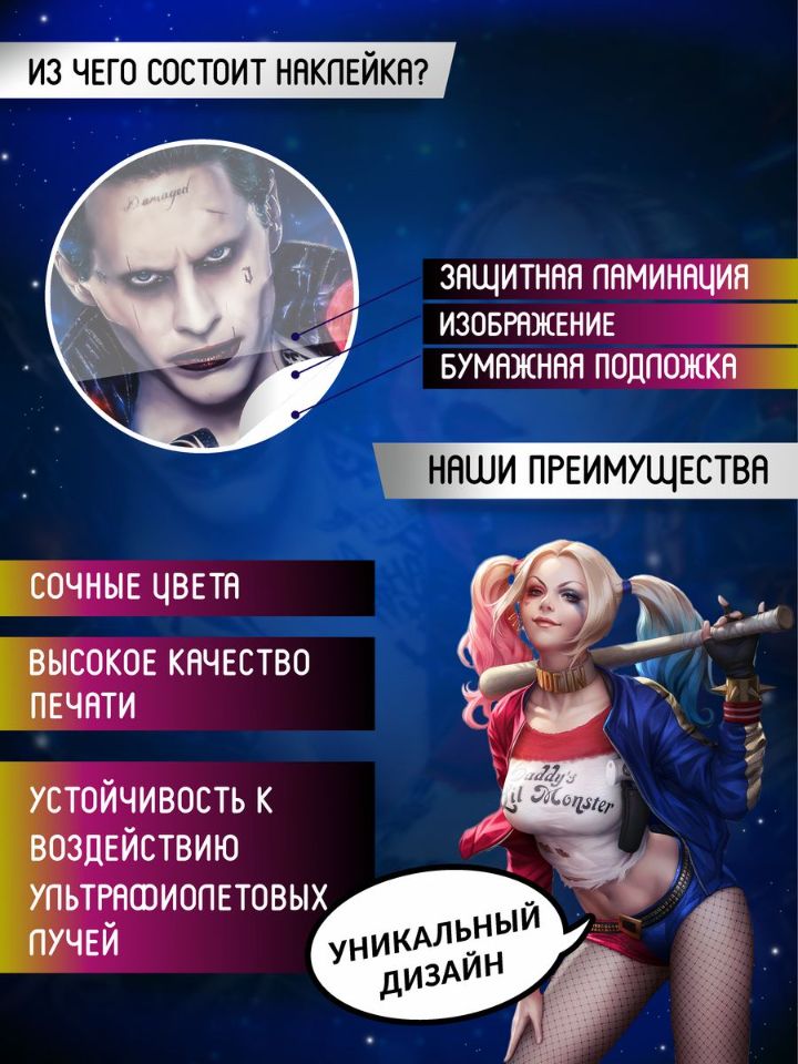 Отличное качество печати будет несомненно привлекать внимание на дорогах и выражать твою индивидуальность. А так же поможет замаскировать несовершенства и будет своеобразным камуфляжем. Да и автовинил хорошее противоугонное средство. Харли Квин довольно яркий персонаж - такой авто сложно провести по дорогам незамеченным.