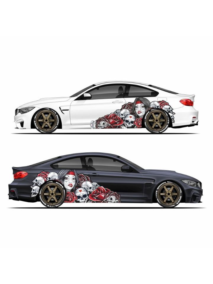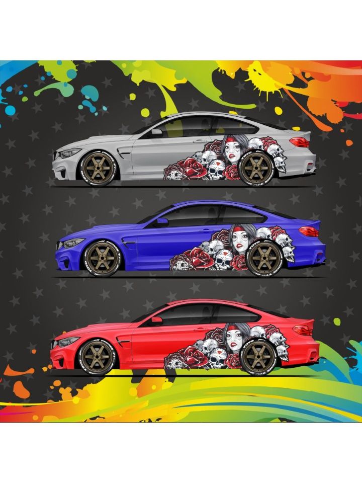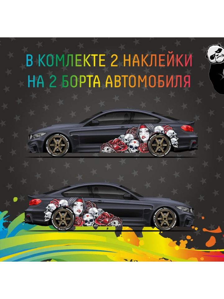 Наклейка на авто большая - В данной коллекции Myertos представленно несколько образов и цветов. Образ богини Муэртос - это главный символ самого шикарного и красочного празничного карнавала мексики. Все чаще этот образ вместо тату - используют как украшение автомобиля. И ведь действительно, страшно красивая богиня смотрится на авто, как будто создана для винилографии.